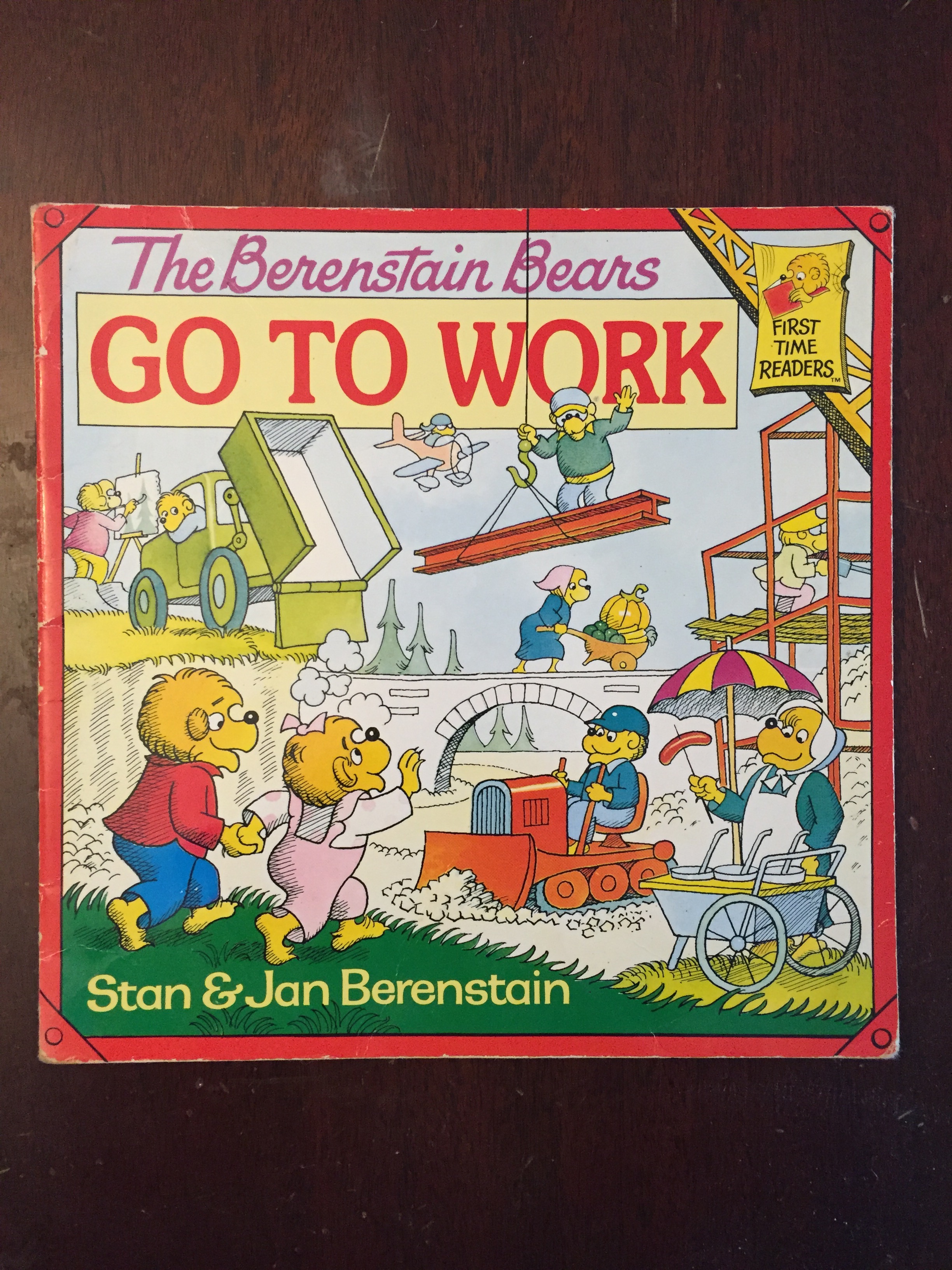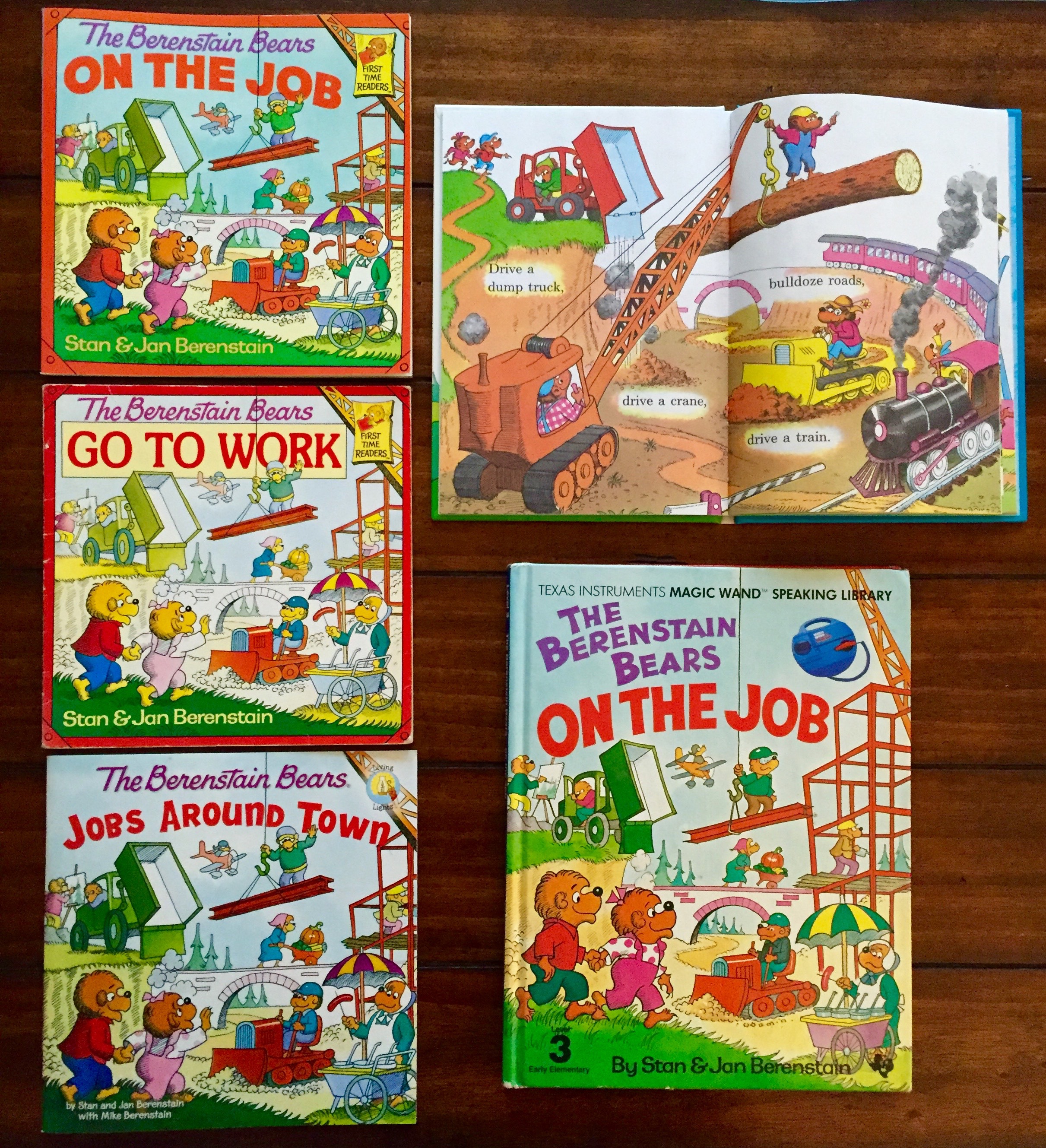 And while this electronic edition was published in limited quantities, The Berenstain Bears On the Job came alive again in 1987 when Random House published the book as part of their First Time Readers series. Shortly thereafter, the book was released in the U.K. and Australia under the title, “The Berenstain Bears Go to Work.” This book also includes slight revisions to the story’s text, as seen below. The American to British English “translation” is an especially unique and prized part of any Berenstain Bears collection.